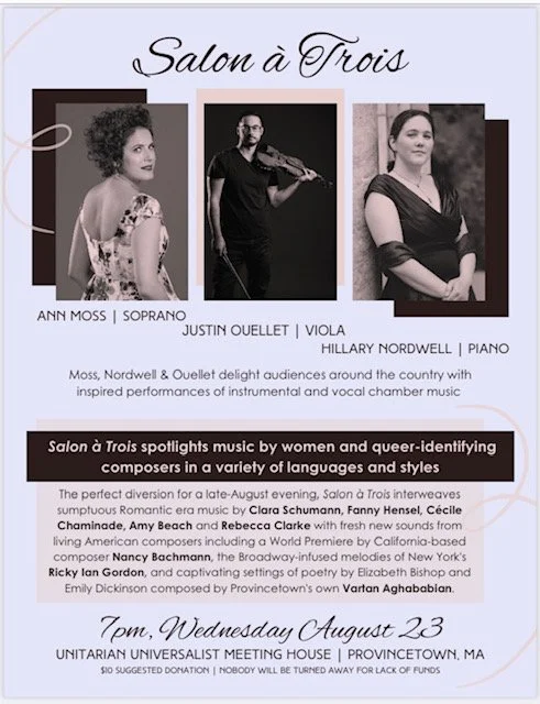 Ann Moss, soprano; Justin Ouellet, viola, Hillary Nordwell, piano. Spotlights music by women and queer-identifying composers.